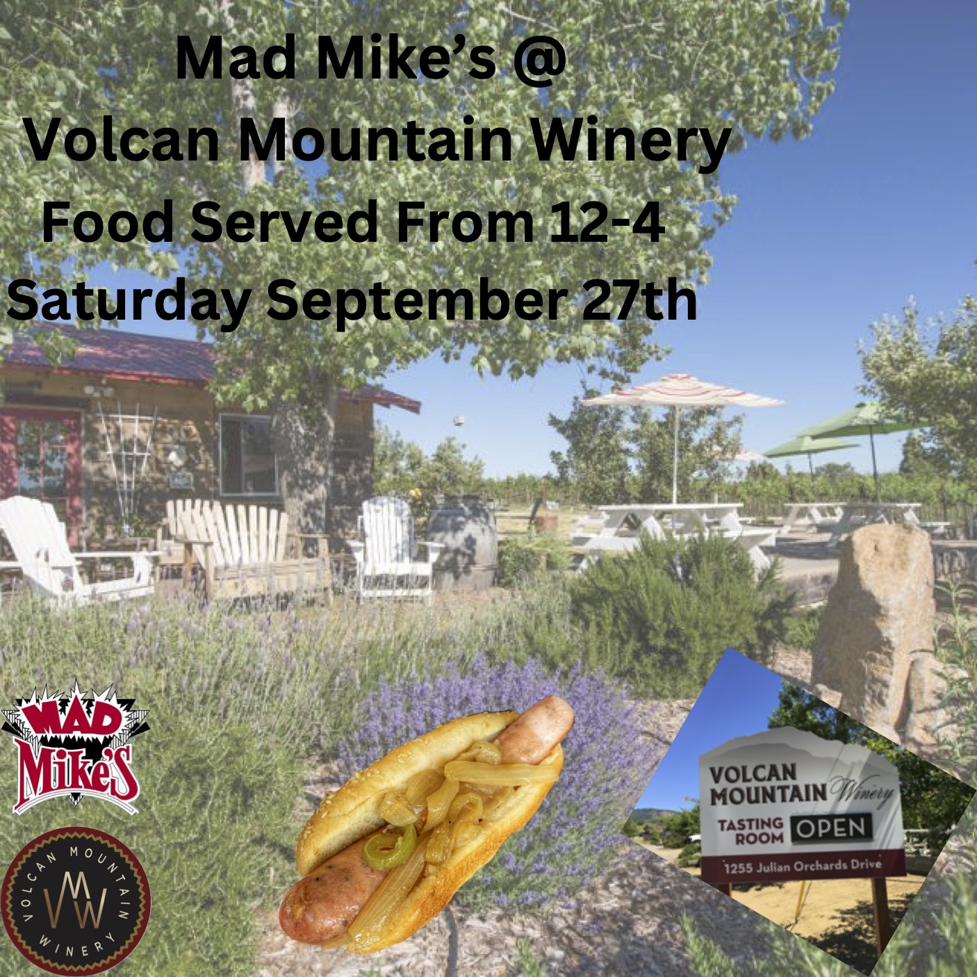 Volcan Mountain Winery 1255 Julian Orchards Drive, JulianJoin us at Volcan Mountain Winery for Julian's Annual Grape Stomp Days! Mad Mike's will be serving food from 12-4